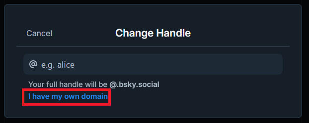 In order to change your Bluesky Handle, you'll need to go to Settings > Advanced > Change HandleYou can change your handle to anything and it will end in .bsky.social!However, if you have your own domain and want to make that your handle, select "I have my own domain." This will pull up a DNS Panel, and it will tell you to add some information to your domain.